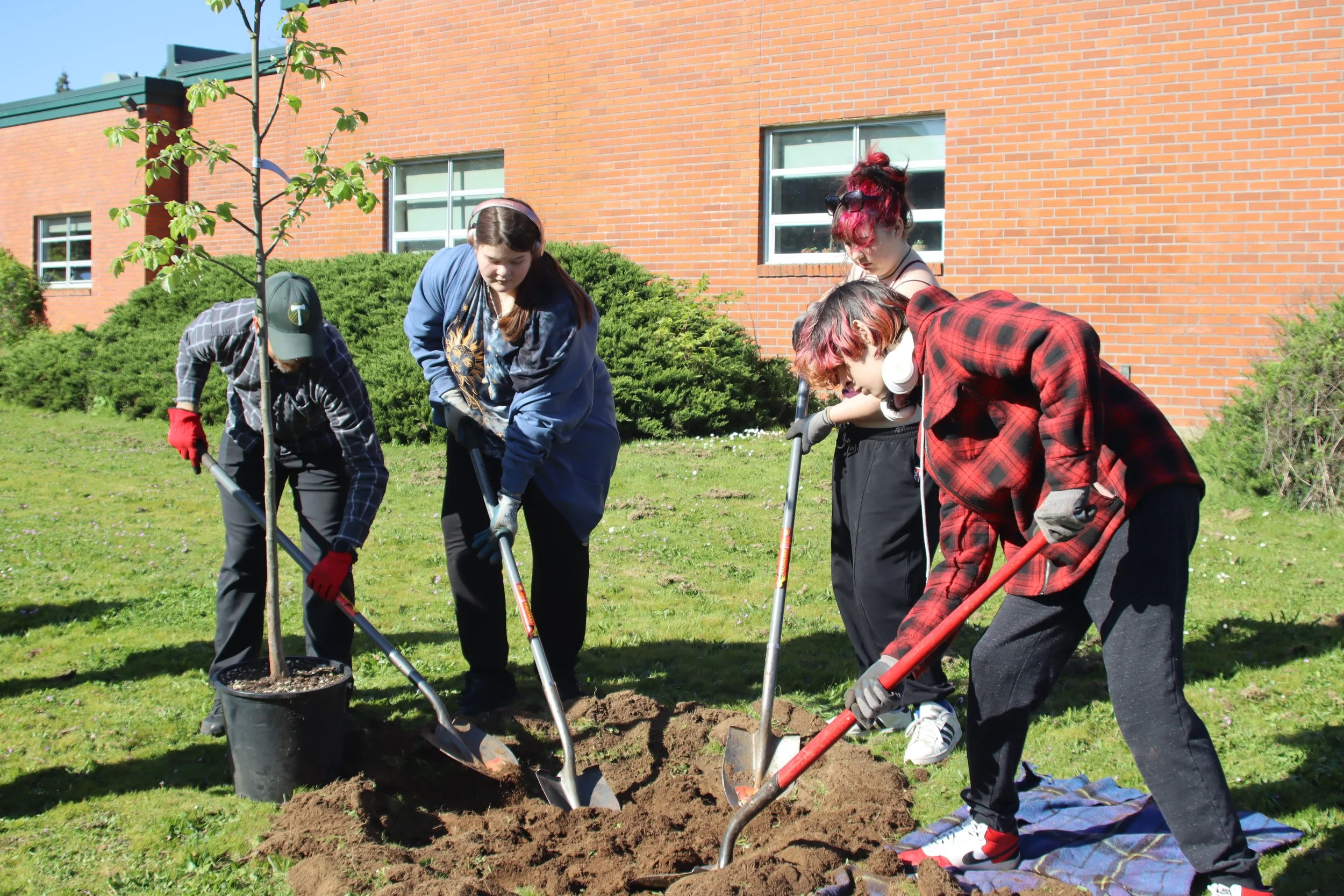 Alliance High School student digging a hole for the new Sterling silver linden on April 19.