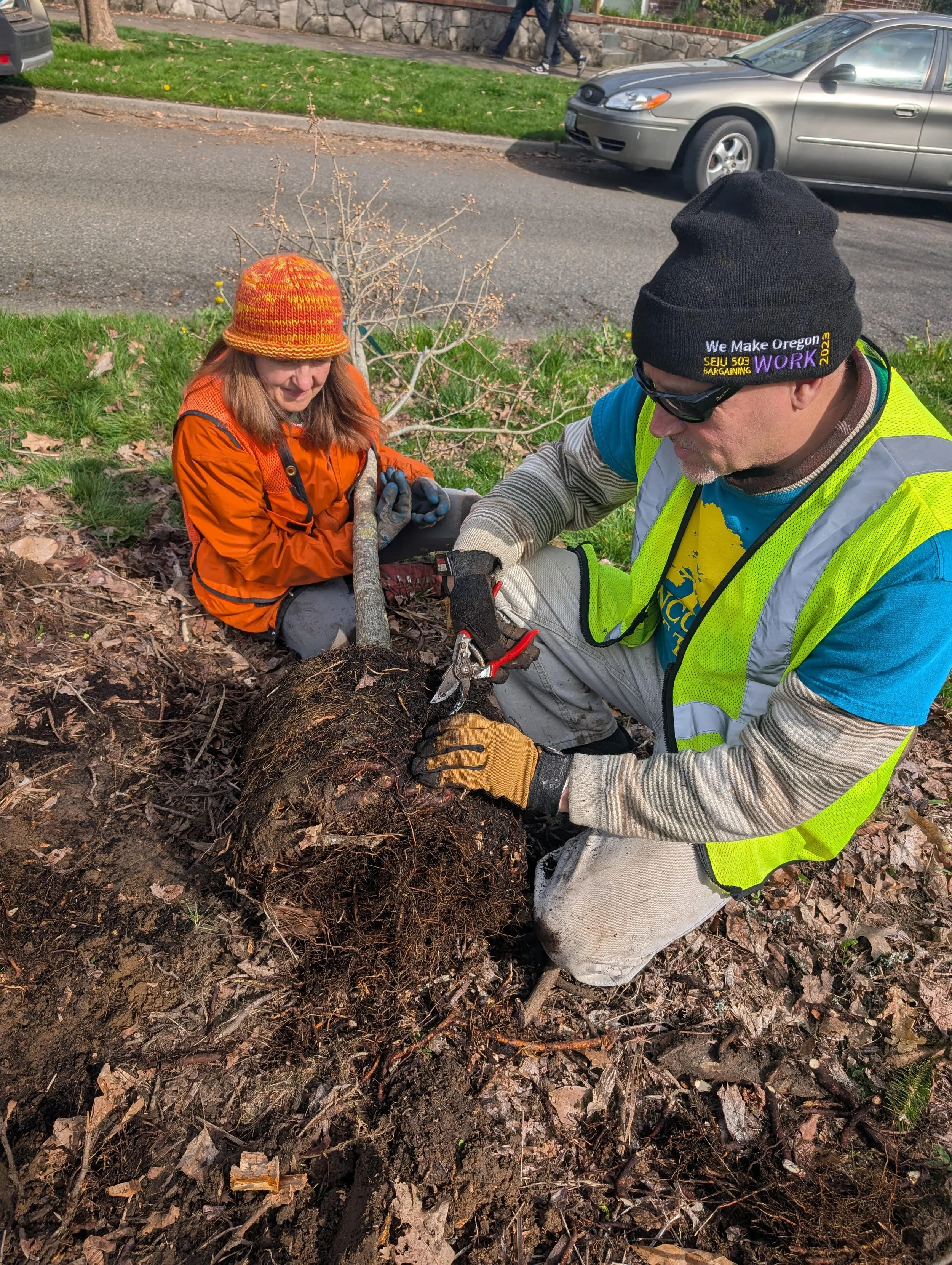 Jim Gersbach and Mallory Pratt worked for an hour to loosen the roots, noting that science shows you can be aggressive about root trimming and the tree will be healthier for it. Nice to meet you, Thad and Suki!